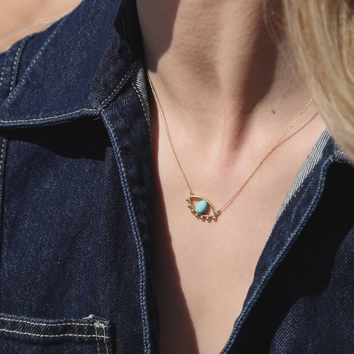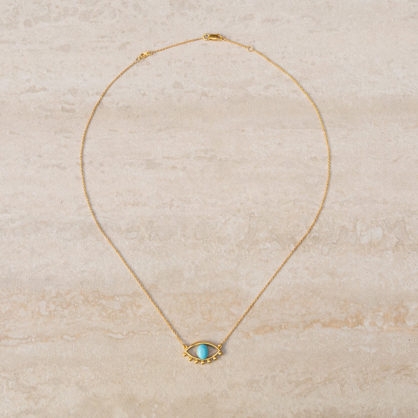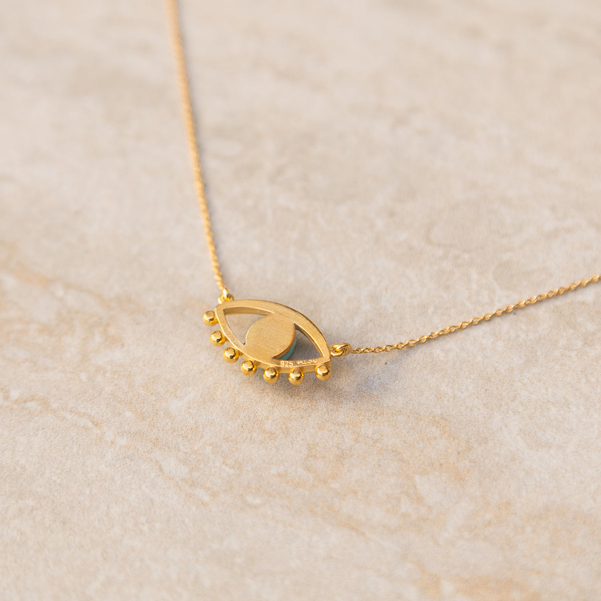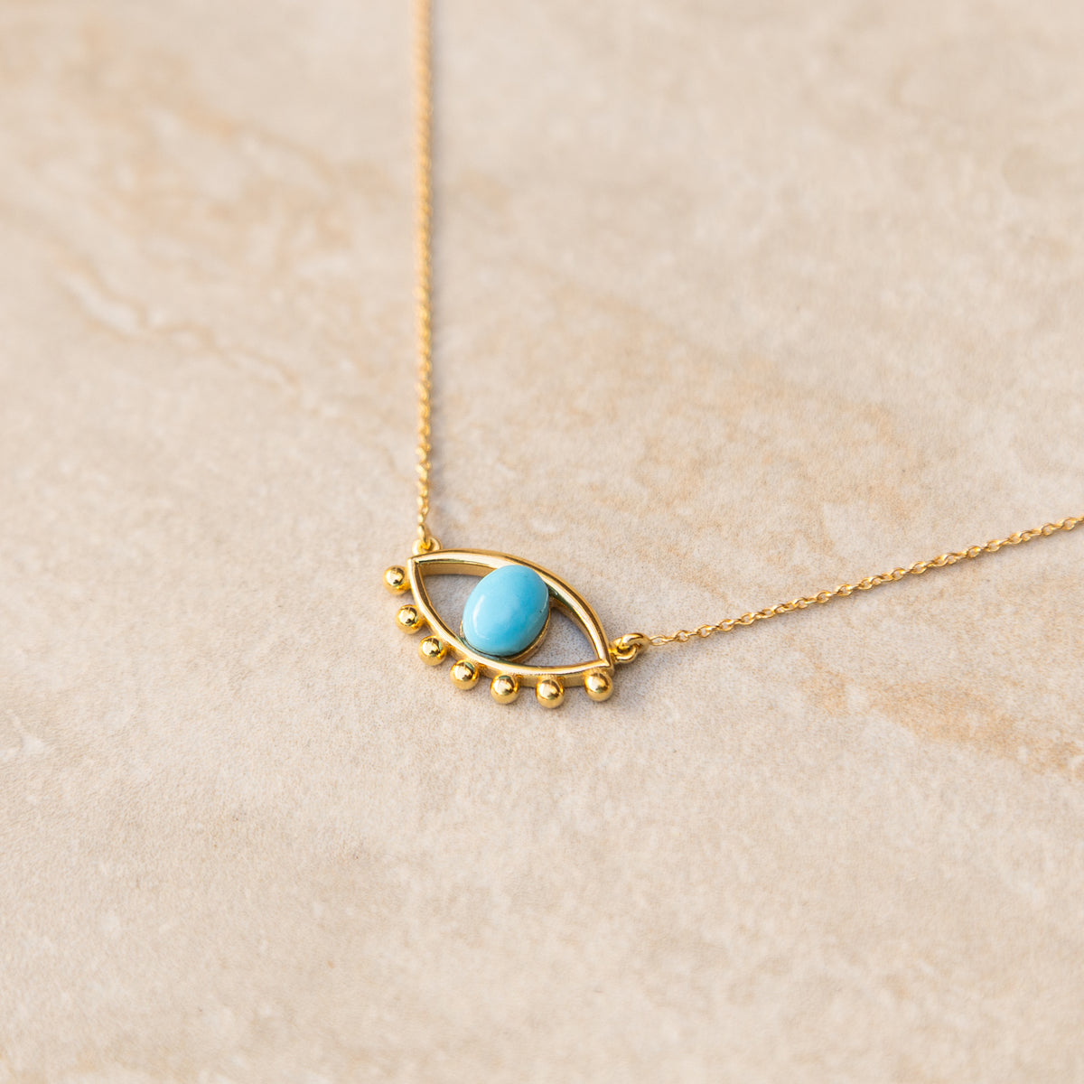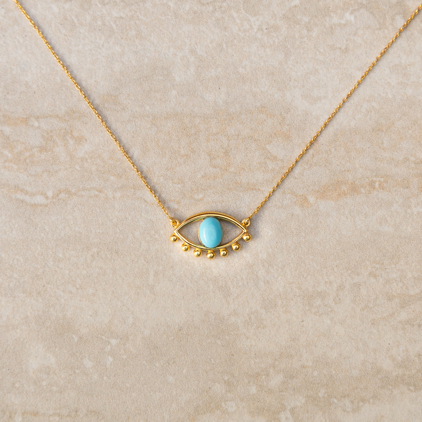 This captivating pendant features a striking eye design with a vivid turquoise center stone, symbolizing protection and clarity. Crafted in sterling silver and luxuriously coated in 24kt gold vermeil, the piece is finished with delicate beading that adds texture and shine.