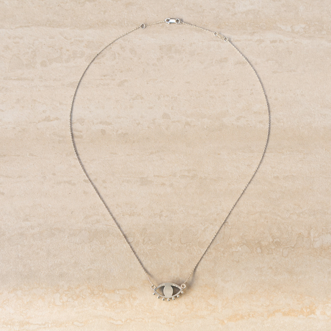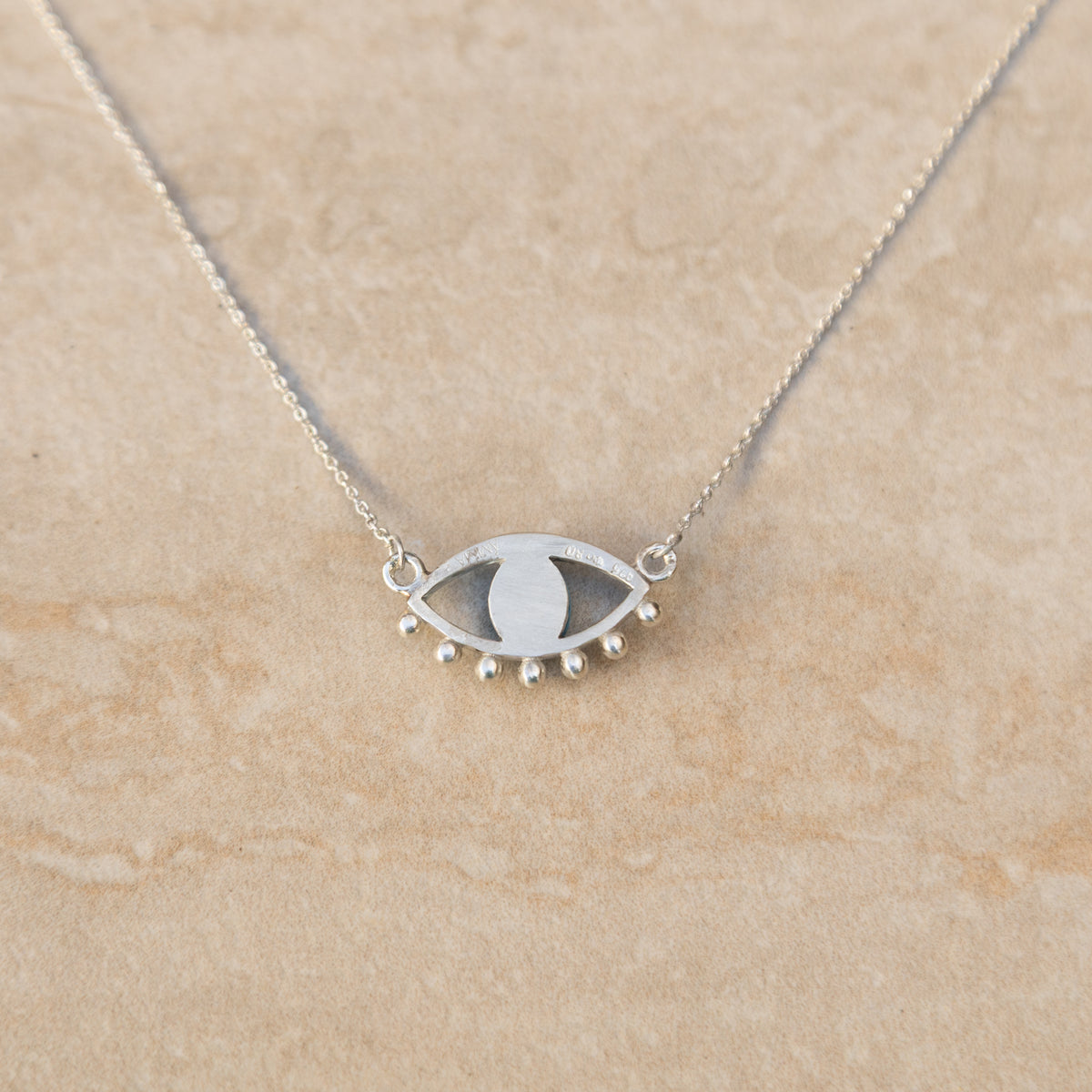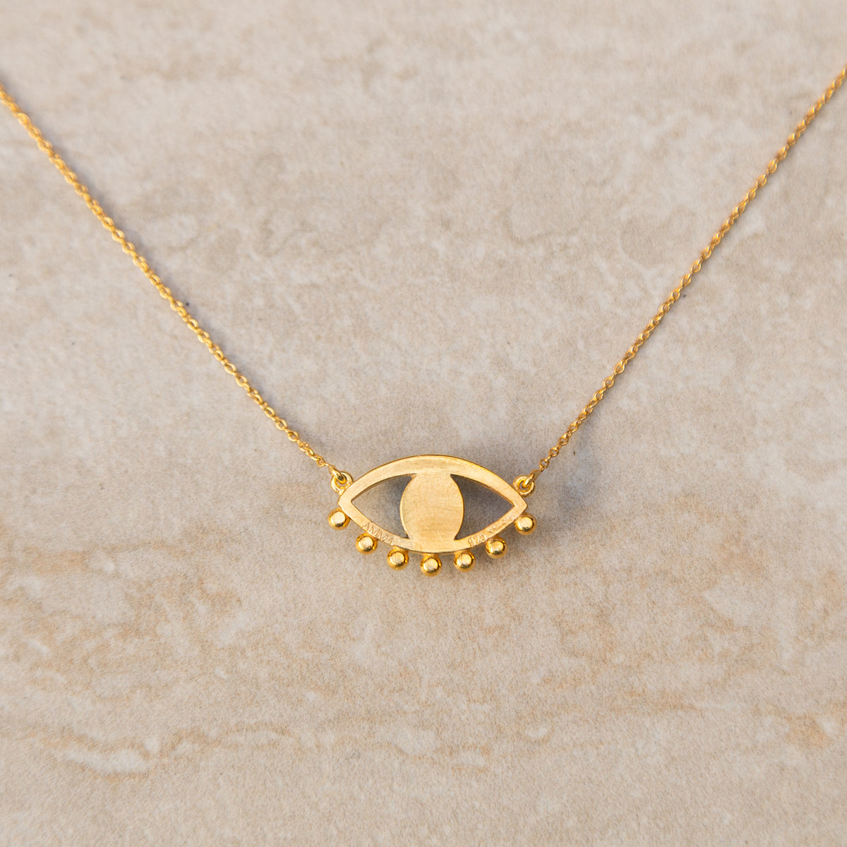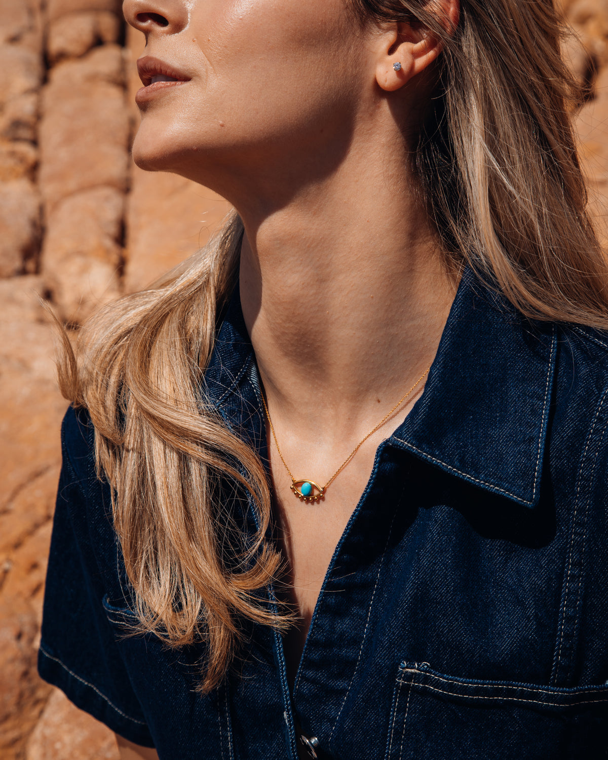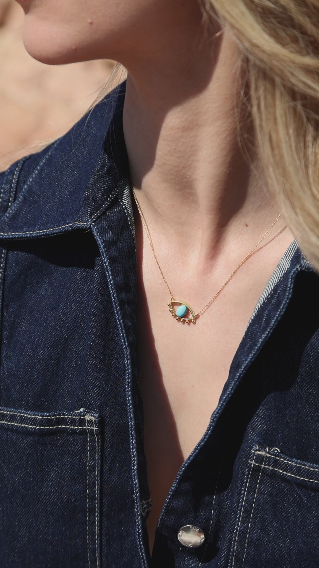 This captivating pendant features a striking eye design with a vivid turquoise center stone, symbolizing protection and clarity. Crafted in sterling silver and luxuriously coated in 24kt gold vermeil, the piece is finished with delicate beading that adds texture and shine.