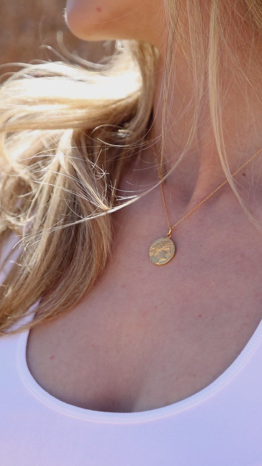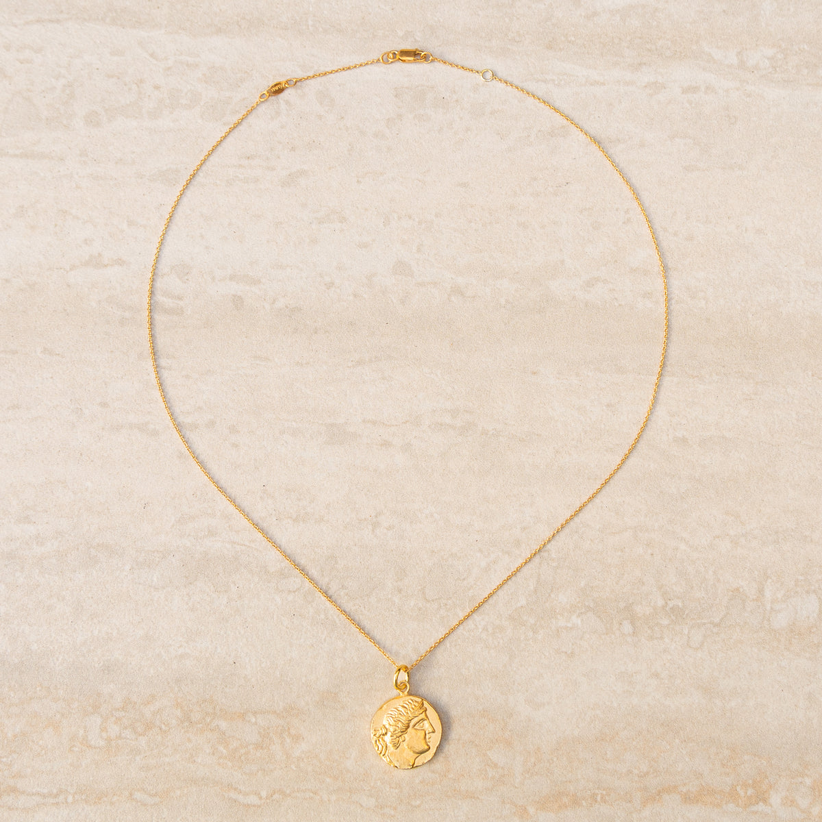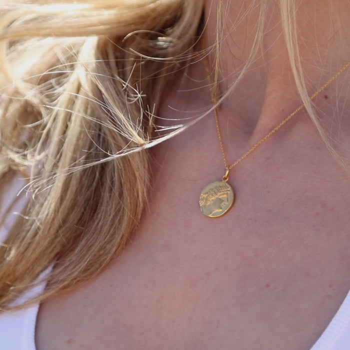 Inspired by the goddess of the hunt, moon, and wilderness, this double-sided pendant channels Artemis’s fierce independence and quiet power. One side reveals her graceful profile crowned by a crescent moon; the other features a stag, her sacred companion and symbol of intuition and freedom.